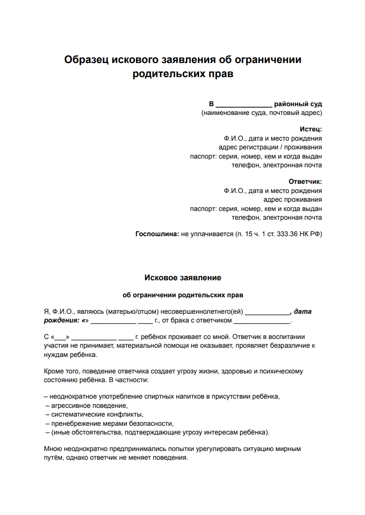 Образец искового заявления об ограничении родительских прав