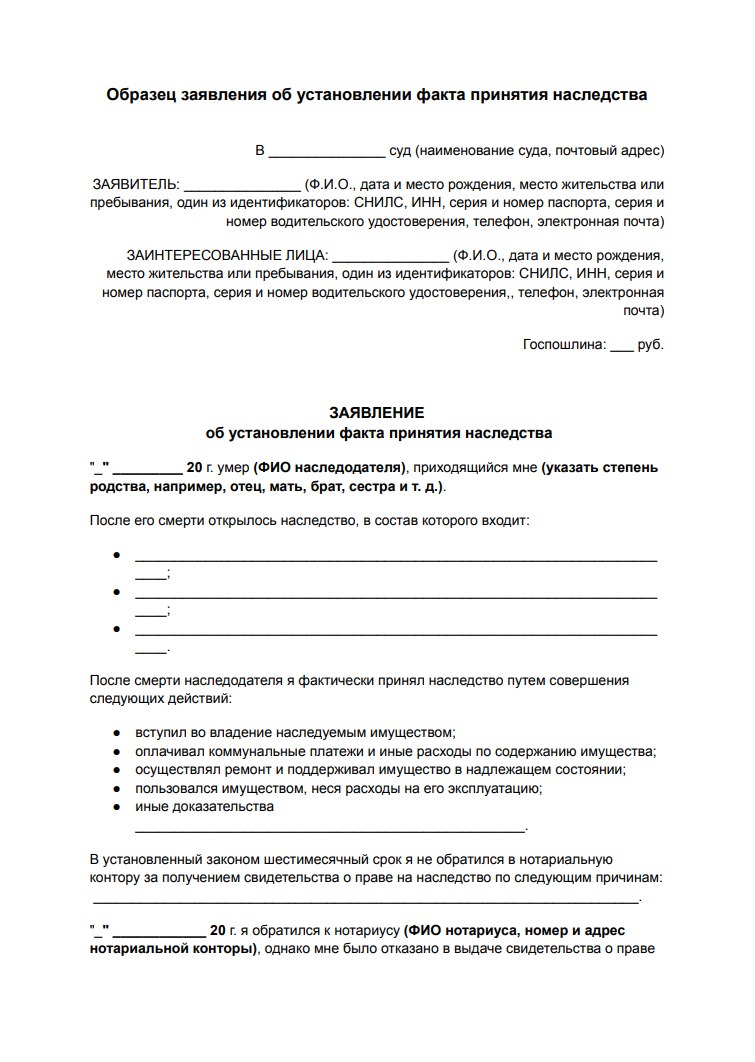 Заявление об установлении факта принятия наследства состоит из нескольких ключевых элементов, которые необходимо правильно оформить: